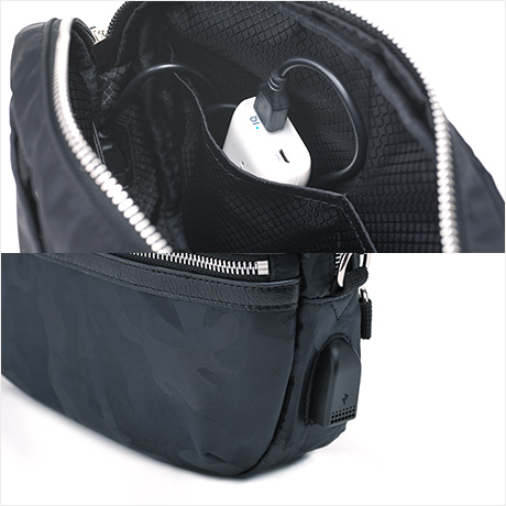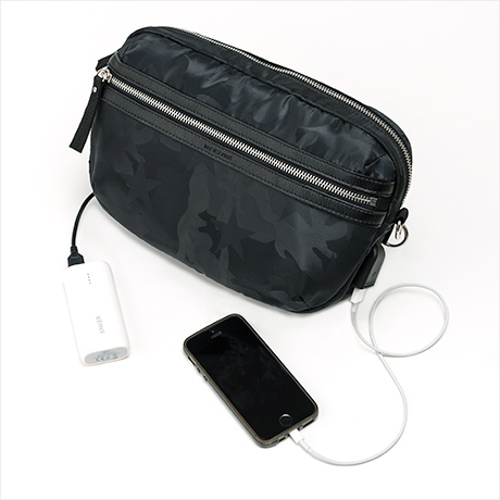 バッグの中にモバイルバッテリーを入れて、USBポートでつなげば、スマホを操作しながら充電可能に。旅先でも活躍間違いなし!※内側USBコードは取り外しできます。